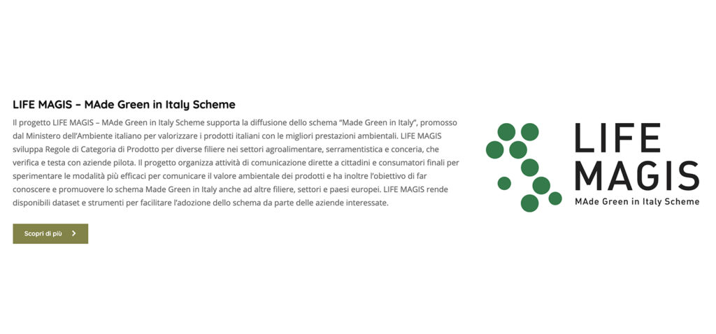 Il progetto LIFE MAGIS – MAde Green in Italy Scheme supporta la diffusione dello schema “Made Green in Italy”, promosso dal Ministero dell’Ambiente italiano per valorizzare i prodotti italiani con le migliori prestazioni ambientali. LIFE MAGIS sviluppa Regole di Categoria di Prodotto per diverse filiere nei settori agroalimentare, serramentistica e conceria, che verifica e testa con aziende pilota. Il progetto organizza attività di comunicazione dirette a cittadini e consumatori finali per sperimentare le modalità più efficaci per comunicare il valore ambientale dei prodotti e ha inoltre l’obiettivo di far conoscere e promuovere lo schema Made Green in Italy anche ad altre filiere, settori e paesi europei. LIFE MAGIS rende disponibili dataset e strumenti per facilitare l’adozione dello schema da parte delle aziende interessate.