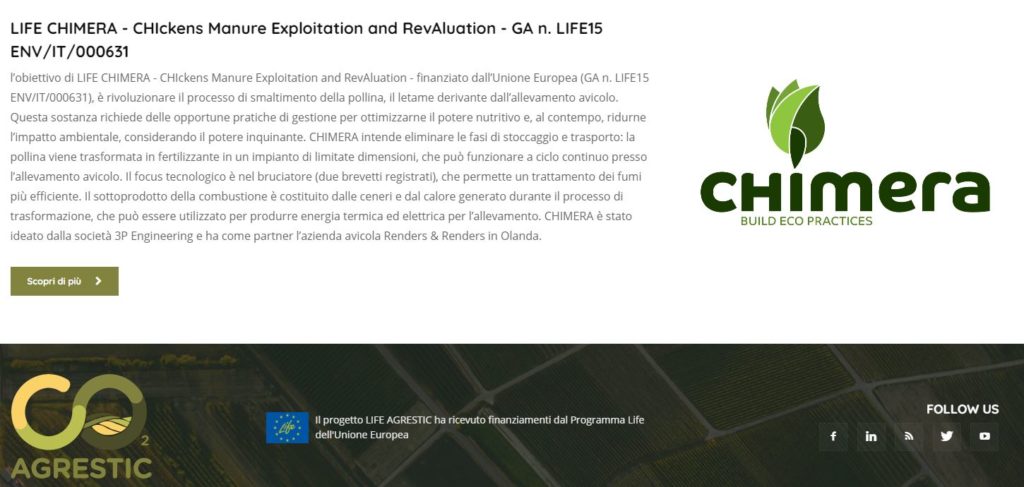 L’obiettivo di LIFE CHIMERA – CHIckens Manure Exploitation and RevAluation – finanziato dall’Unione Europea (GA n. LIFE15 ENV/IT/000631), è rivoluzionare il processo di smaltimento della pollina, il letame derivante dall’allevamento avicolo. Questa sostanza richiede delle opportune pratiche di gestione per ottimizzarne il potere nutritivo e, al contempo, ridurne l’impatto ambientale, considerando il potere inquinante.